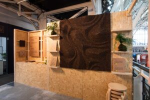 The biological side was of circularity expressed through interior typologies such as walls, insulation and surface finishes. Our space showcased products made from biologically regenerative materials, including timber, cork, pressed flora linen wallpaper, wood fibre insulation, ocean salted water dyes, clay plaster, organic waste lamps, seaweed tiles, plants and moss. These materials were sourced from natural systems and designed to safely return to the environment at the end of their life. Rather than over-processing or disguising them, the design highlighted materials in their purest form. For example, cork panels were heat-pressed to meet commercial performance standards while remaining fully biodegradable.