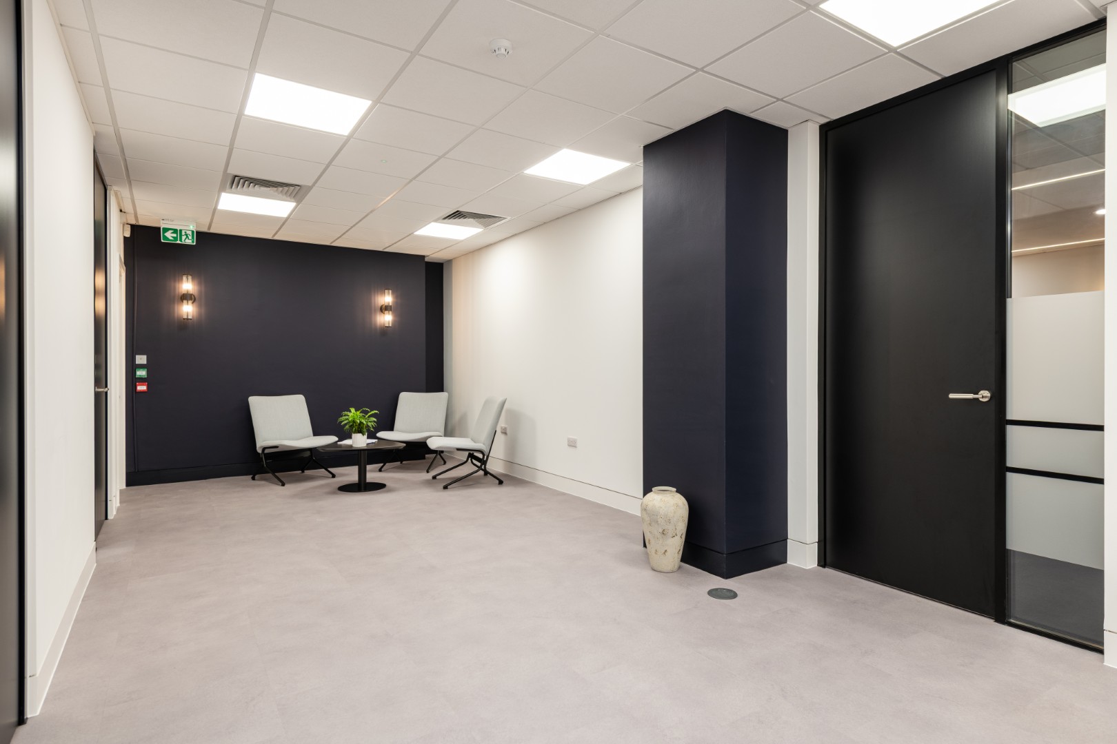 London office interior design with soft seating in visitors waiting area